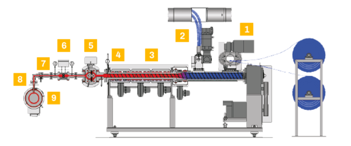 Injection directe de la matière plastique fondue dans l'extrudeuse de production. L'étape intermédiaire de granulation n'est pas nécessaire.